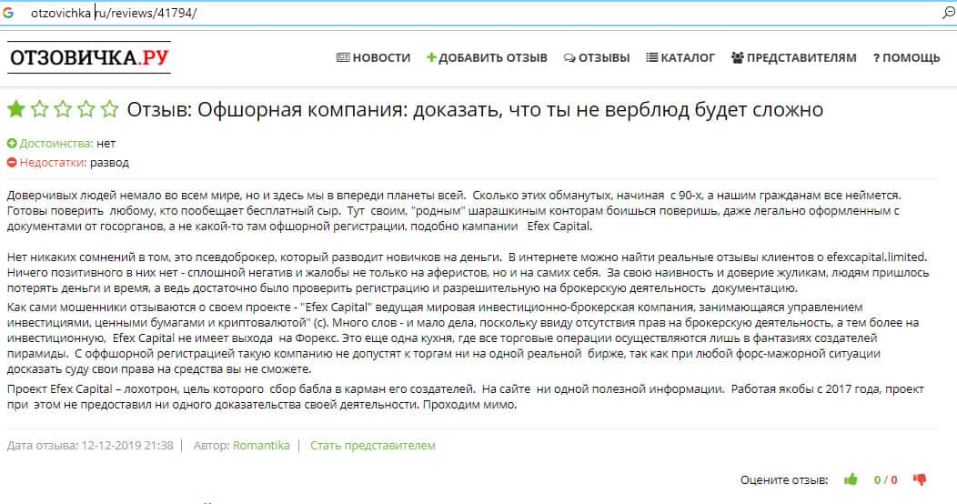 Очередной веб-ресурс не советует торговать через кухню Эфекс Капитал