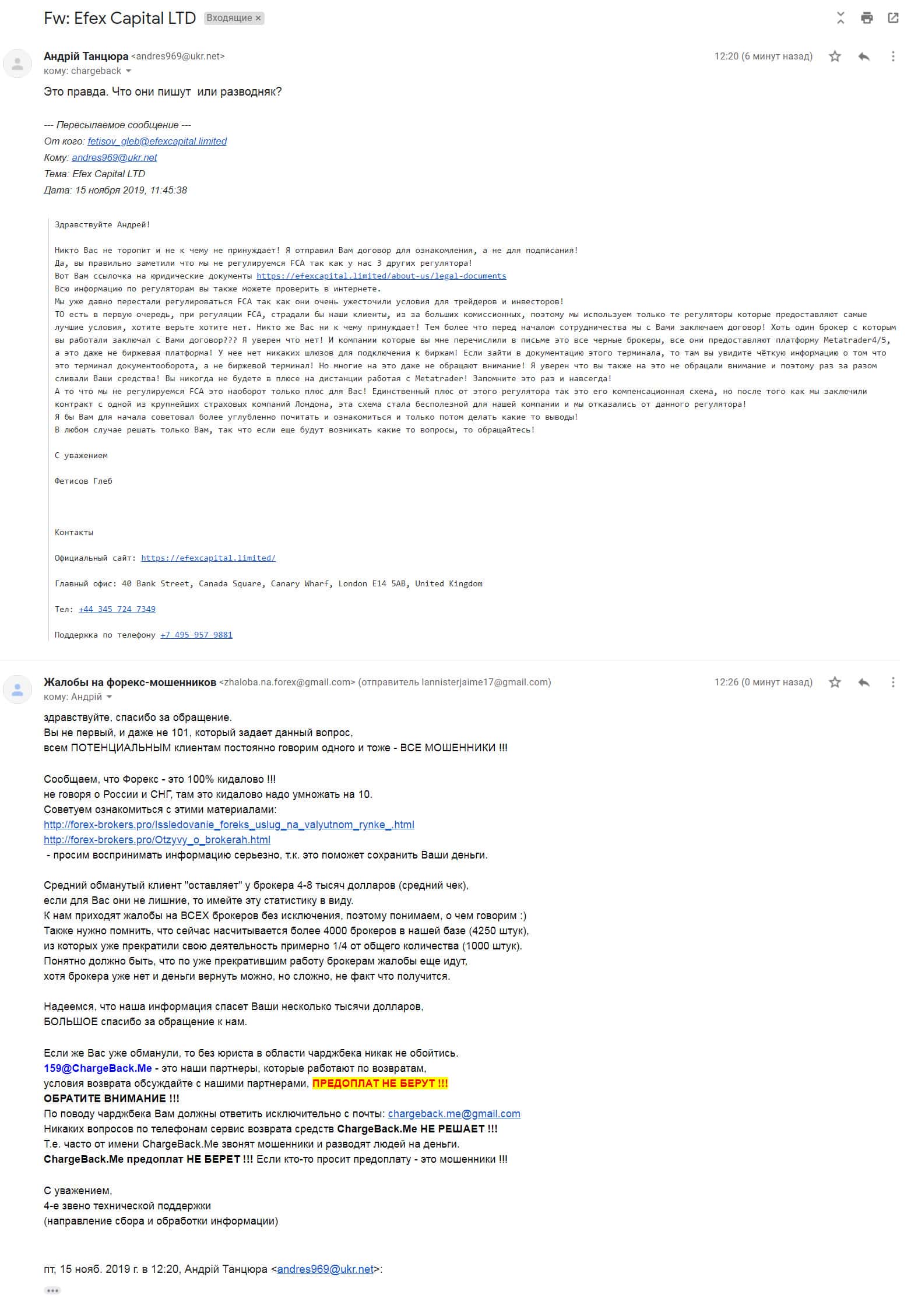 Ниже представлено письмо от одного потенциального клиента конторы Efex Capital, который решил прислать переписку с этими мошенниками. Жулье упирается в тему регуляции и пытается выйти с нее сухими. Они начинают рассказывать, что то что они не регулируются FCA также есть плюс, естественно только для них.