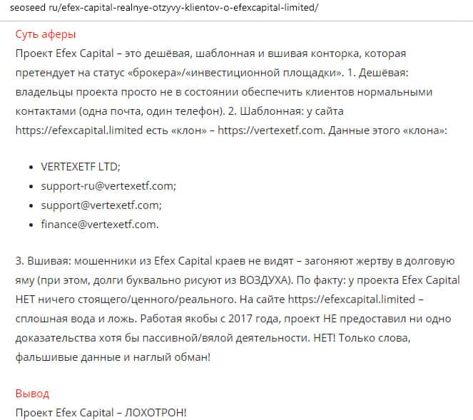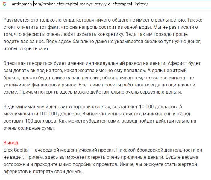 Вот еще одна статья-обзор мошеннической организации Эфекс Капитал, которая раскрывает всю суть работы данного лохотрона. По их мнению, им нельзя доверять, так как мошенники дурят голову клиентам, выманивают деньги, а потом сливают все под ноль. Так что берегитесь этих ублюдков.