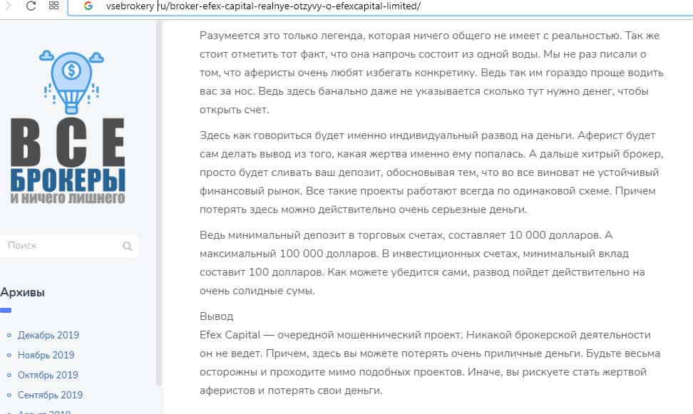 - Развернутый отзыв о жульническом брокере Эфекс Капитал