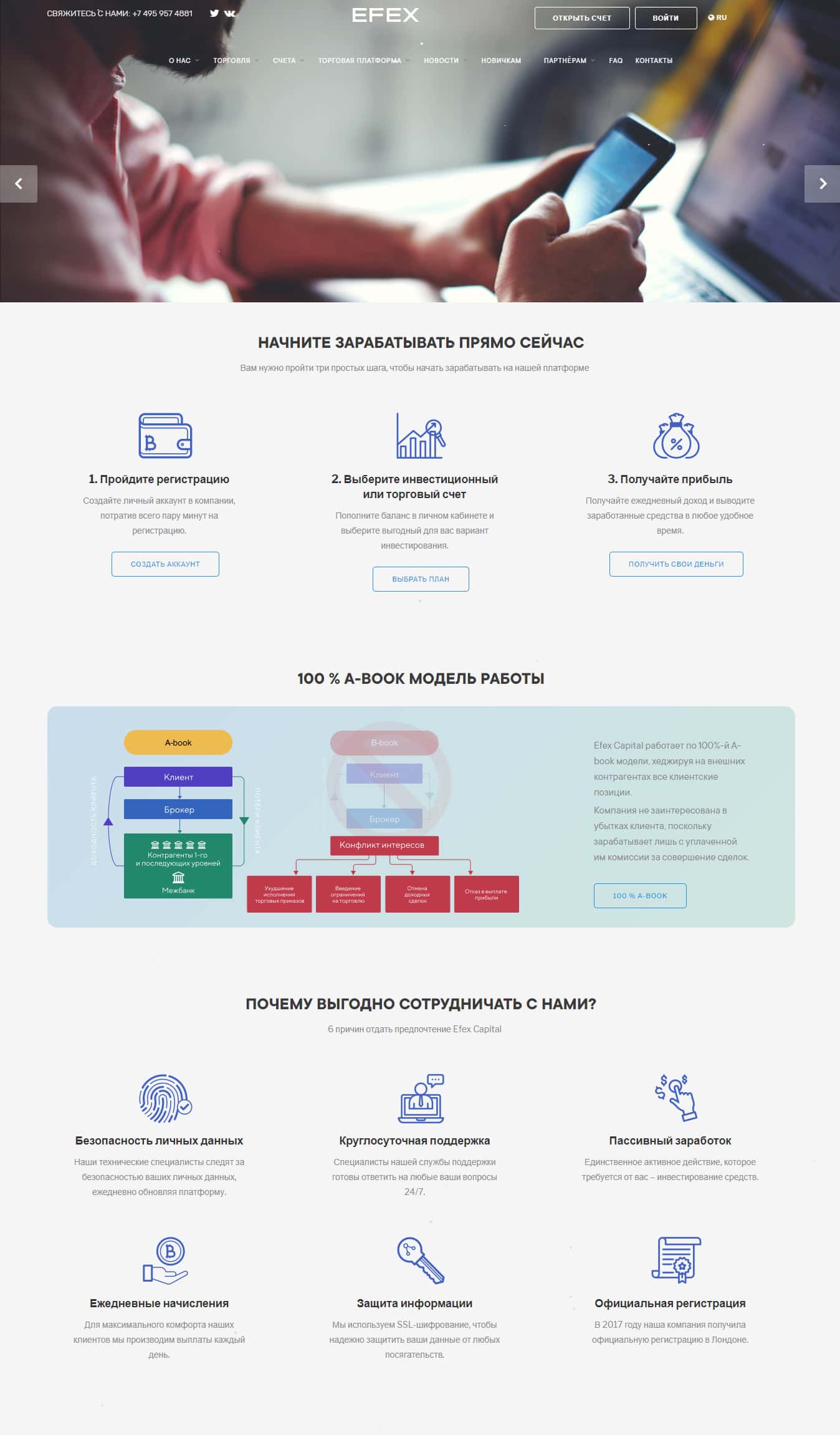 Если зайти на сайт конторы Efex Capital, то здесь можно только найти шаблонные фразы, красивые картинки, а также уговоры, вложить деньги. Шарлатаны всеми правдами и неправдами пытаются уломать посетителя хотя бы оставить свой номер, а дальше уже дело звонарей, которые по полной обработают клиента.