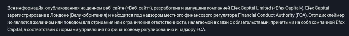 Контора Efex Capital является очередным псевдоброкером, который разводит лохов на деньги. Если начать свое исследование с изучения сайта, то там можно увидеть множество недостатков, из-за которых нет даже смысла копать глубже. То что лохотрон скрывается за различными регуляторами это понятно, но зачем так в открытую врать?