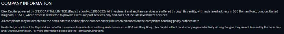 Мошенники Эфекс Капитал настолько обеспокоены своей безопасностью, что в случае если договор с отказом от ответственности не прокатит в суде, то они смело смогут сбежать к себе в Лондон и на них не будут никакой управы. И все же есть зацепки, касательно того, что лохотрон имеет место и номер регистрации, хотя это обычно бывает фейком.