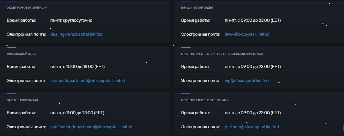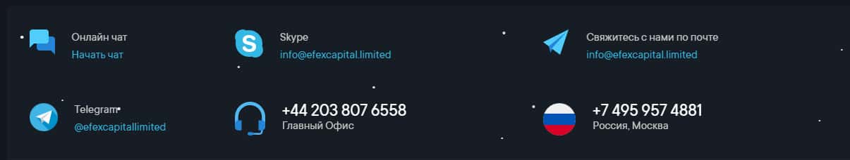 Касательно контактных данных для связи с аферистами Efex Capital, на сайте у них просто изобилие, которое может впечатлить даже опытного трейдера. Но не стоит забывать, что подобный маневр совершается, дабы расположить к вам доверие. Сколько бы там не было контактов, после того как они получат от вас деньги, сразу же скроются. А вот собственно и сами контакты:
