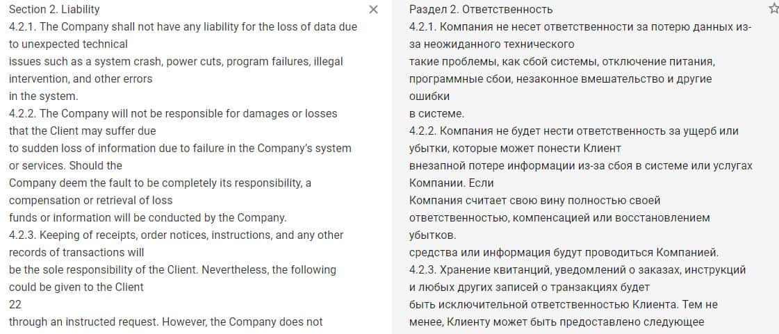Все что нужно знать о договоре конторы Эфекс Капитал, дабы не читать его полностью, это изучить раздел об ограничении ответственности. Мошенники не несут ответственности за потерю данных о клиентах, а также убытках, которые они понесут при сотрудничестве с данной организацией. Так что доказать свою правоту, а тем боле компенсировать утраченное нет возможности.