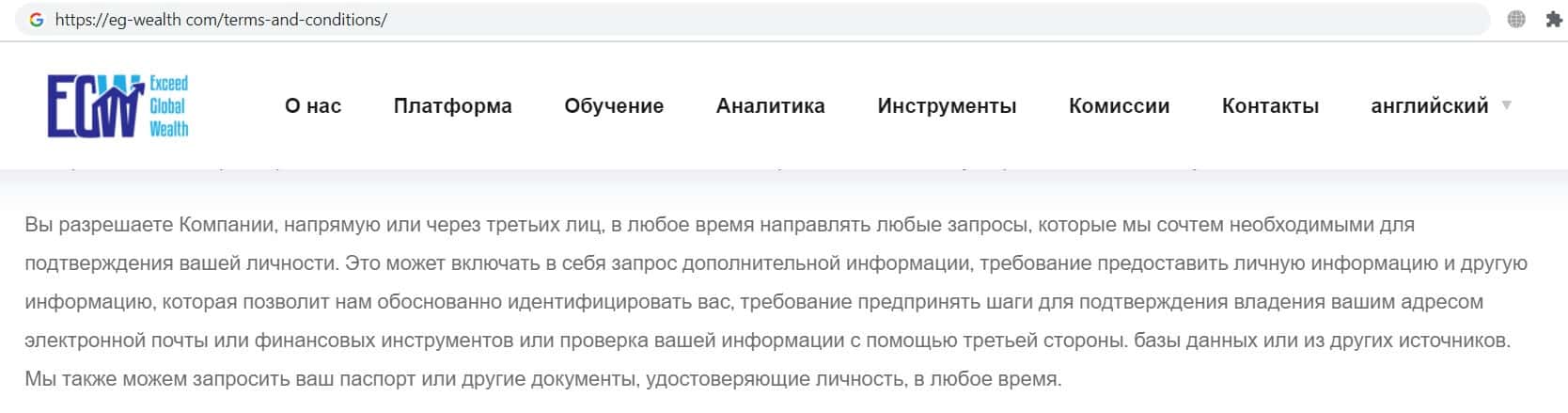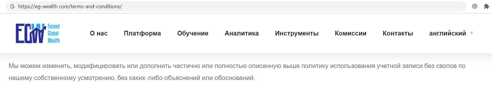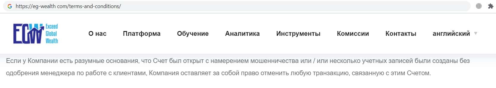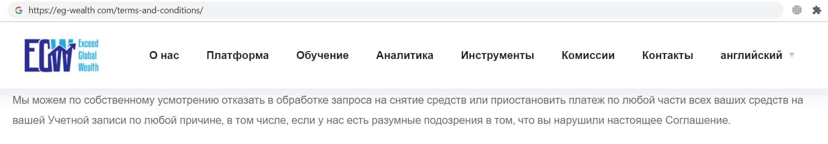 Фальшивый брокер EG Wealth указал в данном пункте соглашения, что имеет полное право отказать своему клиенту в запросе на вывод денежных средств.