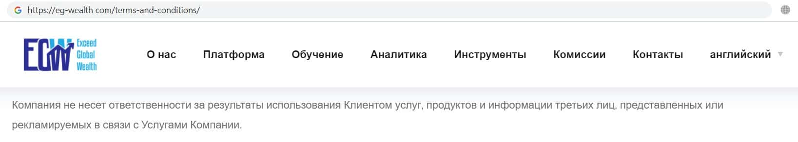 Ниже представлен пункт клиентского соглашения псевдоброкера EG Wealth, в котором компания указала, что не несёт ответственности за результаты использования услуг.