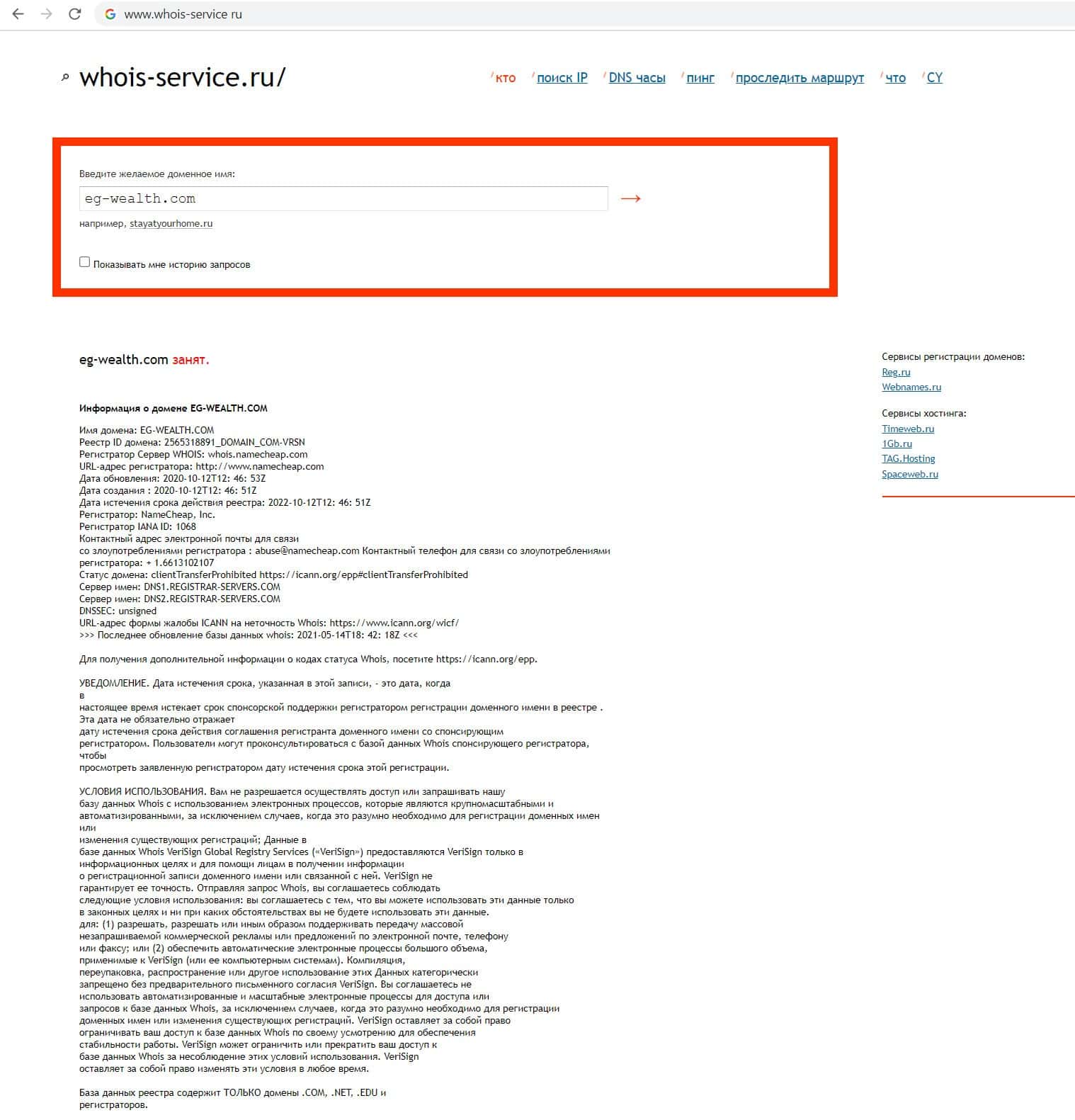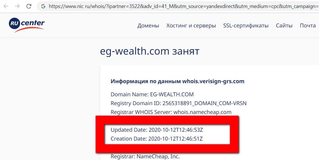 Для того, чтобы узнать возраст сайта аферистов EG Wealth мы использовали онлайн-сервис nic ru. Выяснилось, что мошенники врут о своём опыте. так как сайт был создан в 2020 году.