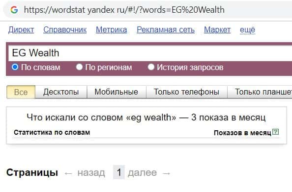 Мы проверили количество запросов компании мошенников EG Wealth в Яндексе по названию фирмы, а именно "EG Wealth". Данный запрос пользователи совершили всего 3 раза.