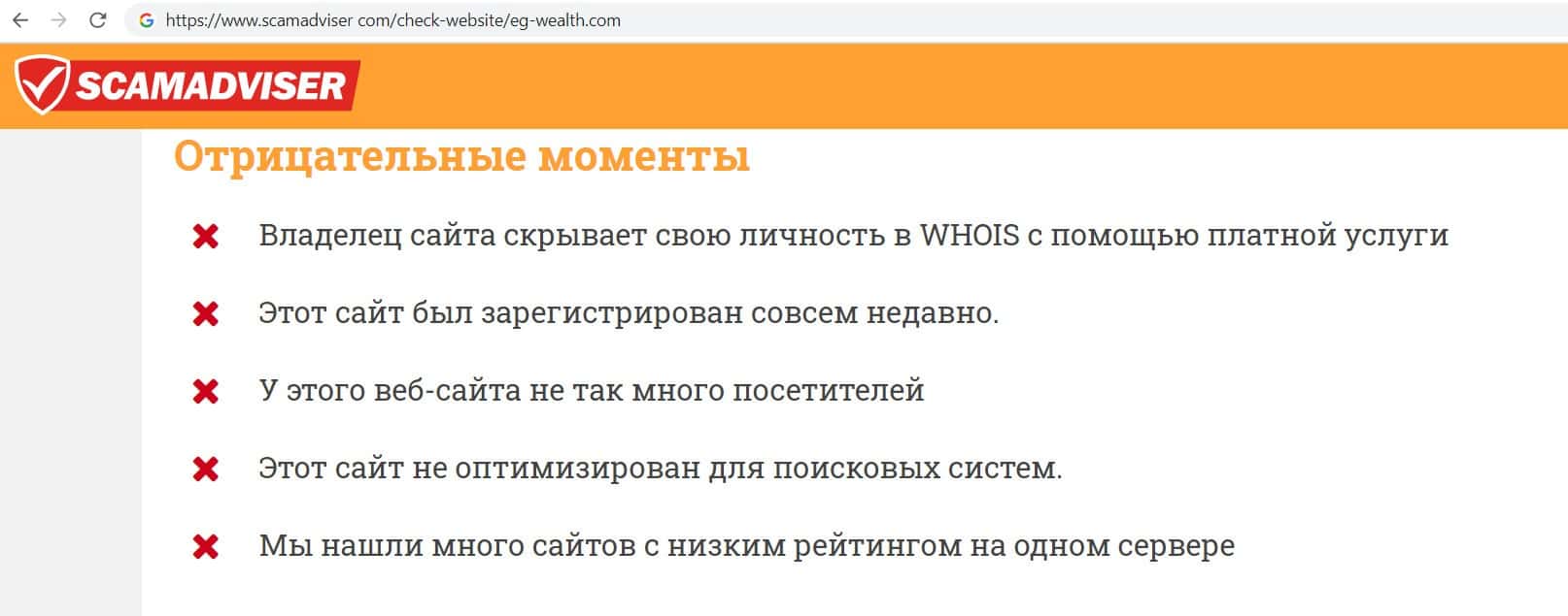 Мы проверили сайт жуликов EG Wealth через сайт scamadviser com. Оказалось, что сайт мошенников очень молодой, имеет мало посетителей а его владелец скрывает свою личность.
