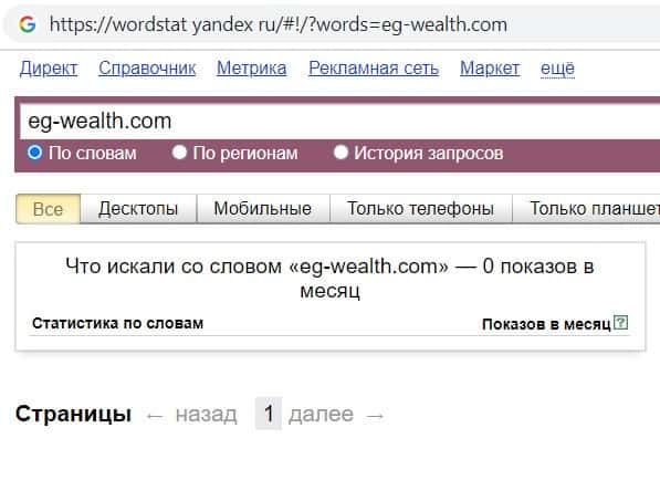 Напоследок мы проверили количество запросов мошеннического проекта ЕГ Виалт по домену компании с точкой а именно "eg-wealth.com", но даже этот запрос никто не выполнял.