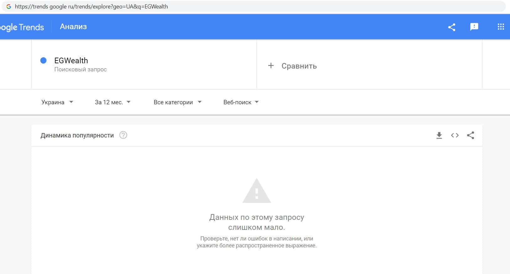 Мы решили проверить количество запросов компании разводил EG Wealth в Google по названию фирмы, а именно "EG Wealth". Данный запрос пользователи не выполняли.