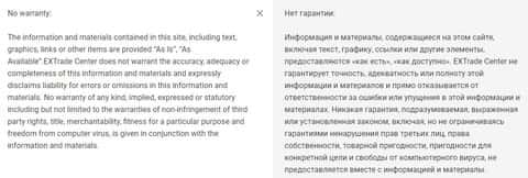В клиентском соглашении кухни EXTrade Center, как говорится, что и требовалось доказать. Мошенники сразу снимают с себя ответственность и пишут, что не дают никакой гарантии сохранности информации и средств на счету клиента, а также не отвечают за написанный контент на данном портале.