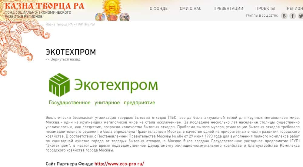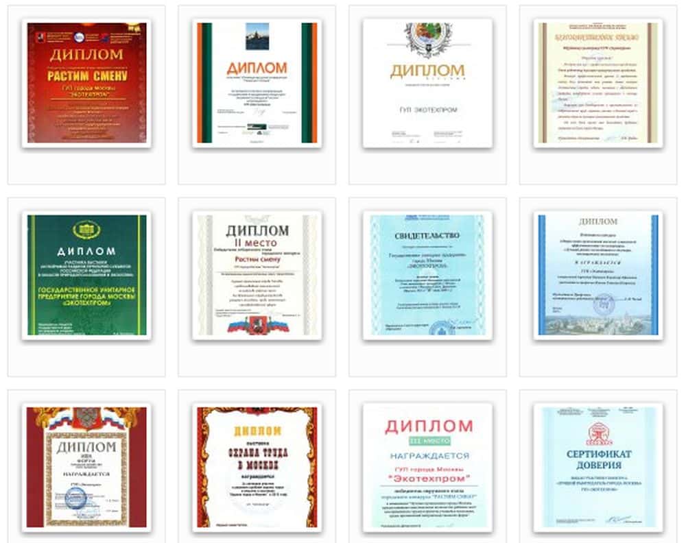 Вообще, все конторы, связанные с группой аферистов Казна РА отличаются склонностью к бредовым фантазиям. Так что помойка Экотехпром - не исключение. Например, они отвели целый раздел для публикации липовых наград. Часть из них получена за экологичность и помощь городу, что никак не соответствует действительности.