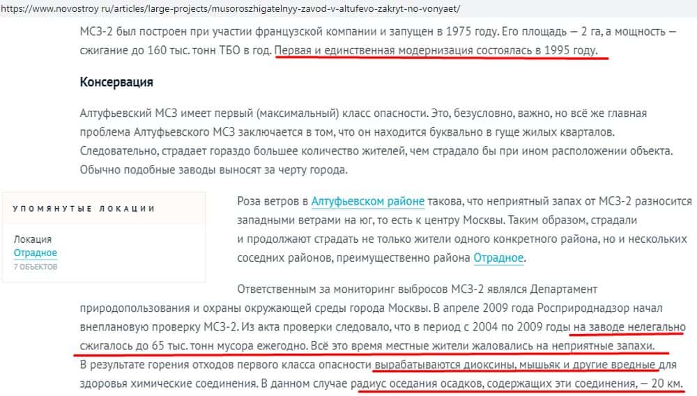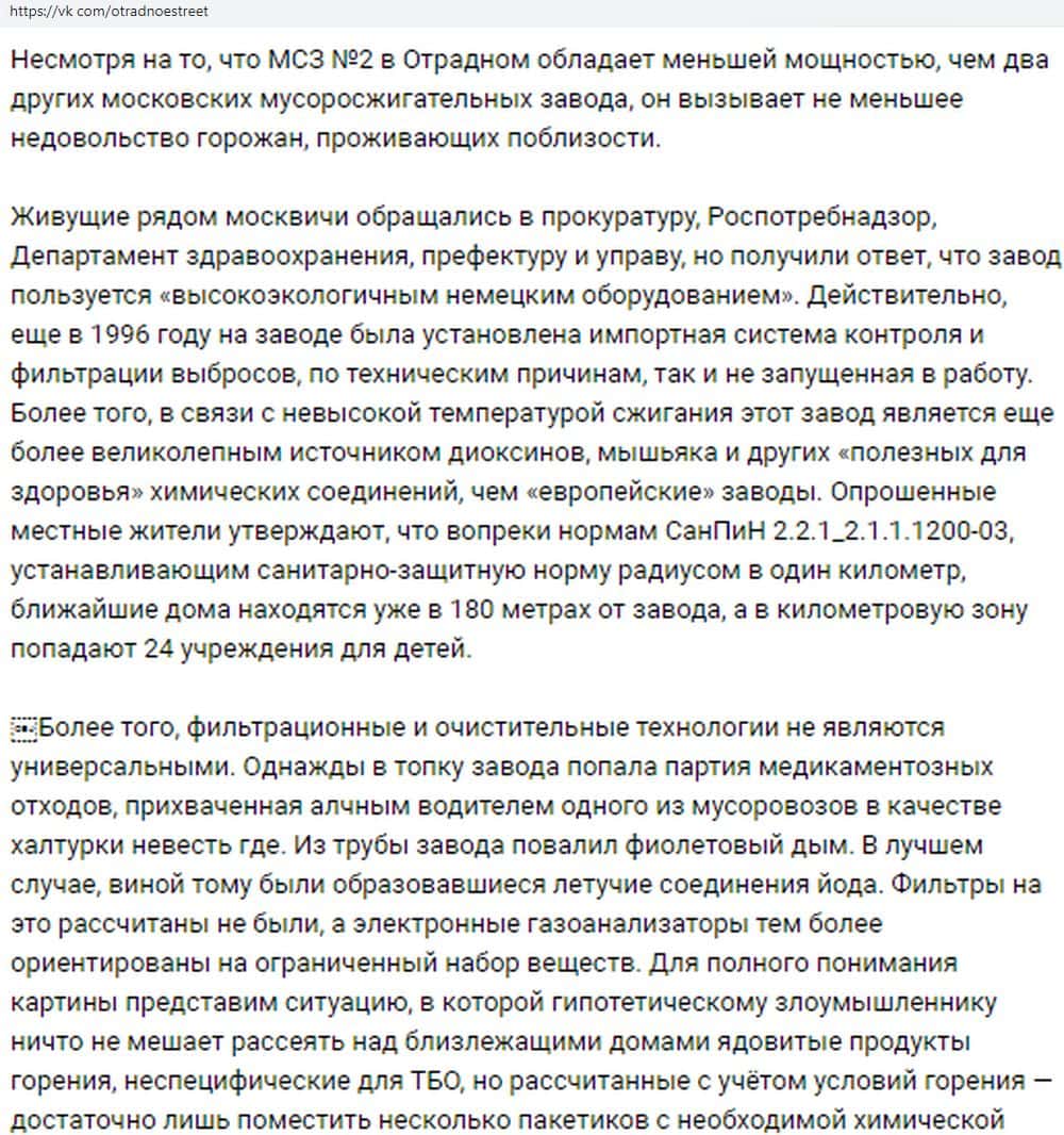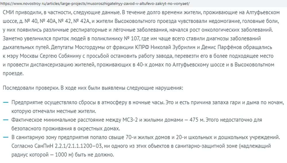 По результатам многочисленных жалоб в 2015 году мусоросжигающий завод, принадлежащий авантюристам Экотехпром, был тщательно проверен. В результате выявили целый ряд нарушений: предприятие располагалось практически вплотную к домам, незаконно сжигало до 65 тыс. тонн мусора, действуя в основном по ночам.