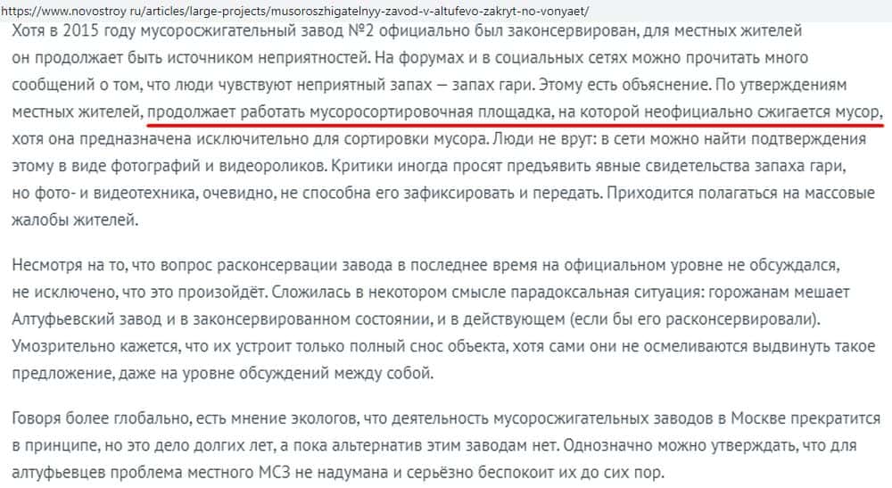 Мусоросжигающий завод закрыли, авантюристы Экотехпром обещали его полностью реконструировать, а пока использовать только как сортировочную площадку. Официально все в норме - вот только хапуги продолжают сжигать мусор по ночам, а иногда и средь бела дня, как ни в чем не бывало, утверждая, что гарь и вонь людям кажется.