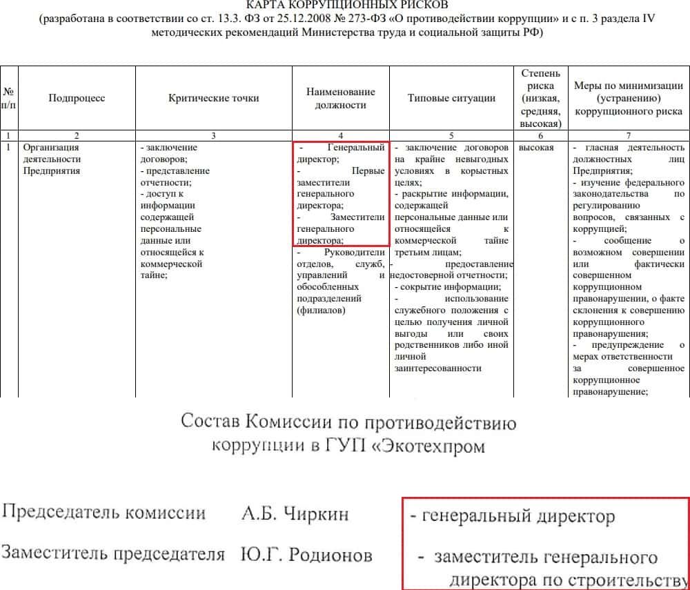 Только вот если просмотреть некоторые из документов, то можно увидеть немного странные вещи. В карте коррупционных рисков на первом месте идет генеральный директор и его заместители, то есть те, за кем нужен глаз да глаз. Но они же и возглавляют свою антикоррупционную комиссию. Аферисты сами на себя охотятся?