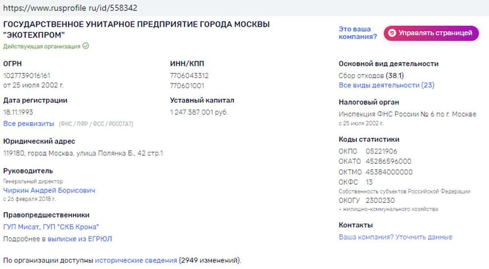 Контора с таким названием действительно зарегистрирована на территории Москва (причем, сразу три - там же управление капитального строительства и профсоюз, очень удобно). Это открытая информация. Правда, уставной капитал жуликов Экотехпром по разным источникам пляшет от полутора миллиардов до нескольких сот тысяч.