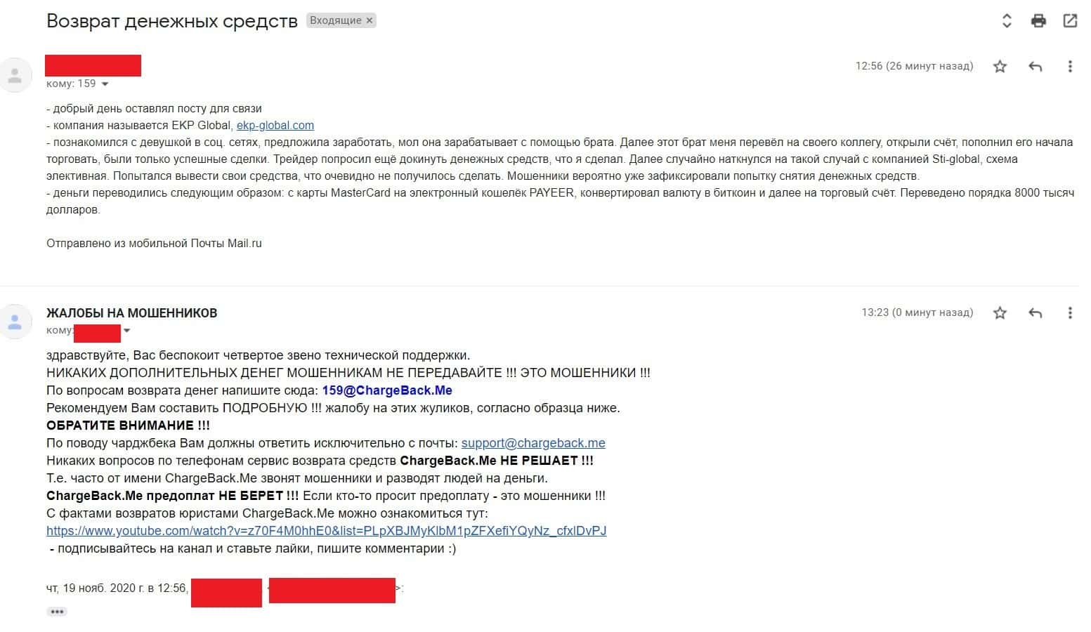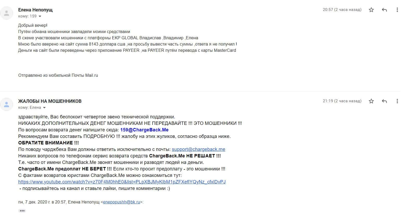 На нижеуказанном изображении можно увидеть электронную почту, любезно предоставленную мошенниками из лжеконторы ЕКП Глобал. Вот, собственно их электронка: