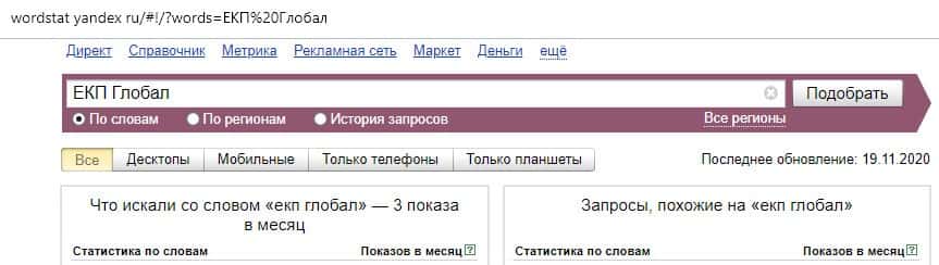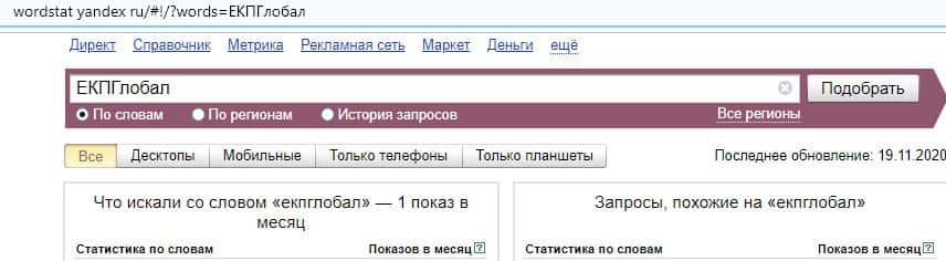 Русскоязычный вариант доменного имени "ЕКПГлобал", вбиваемого без единого пробела в поисковике Яндекс.Вордстат, набрал всего лишь 1 значение по запросам за месяц.