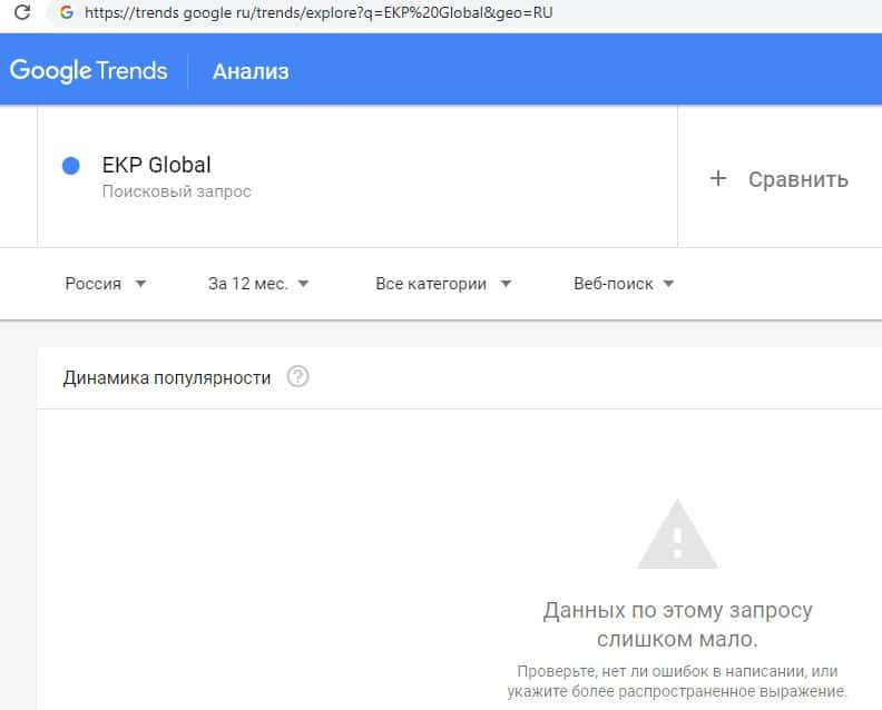 Касательно брендового имени "ekp-global.com" на английском языке с точкой, то его поиск не предоставил ни единого результата на интернет-сервисе Гугл Трендс.
