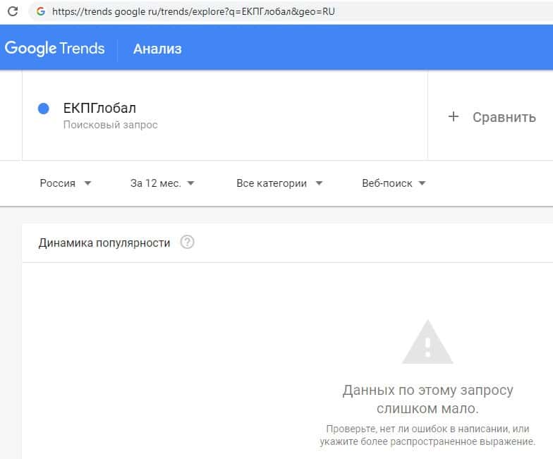 Количество запросов от интернет-пользователей по поиску брендового имени на русском языке с пробелом "ЕКП Глобал" в поисковой системе Гугл Трендс также было очень небольшим.