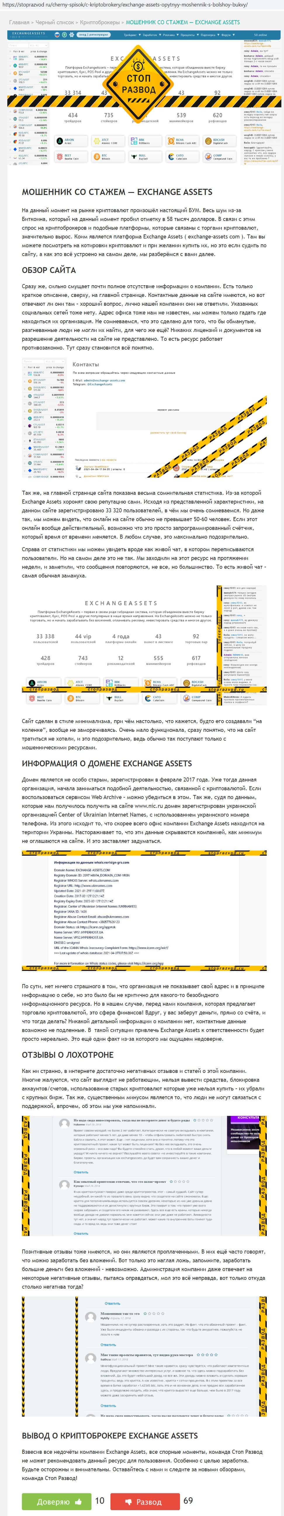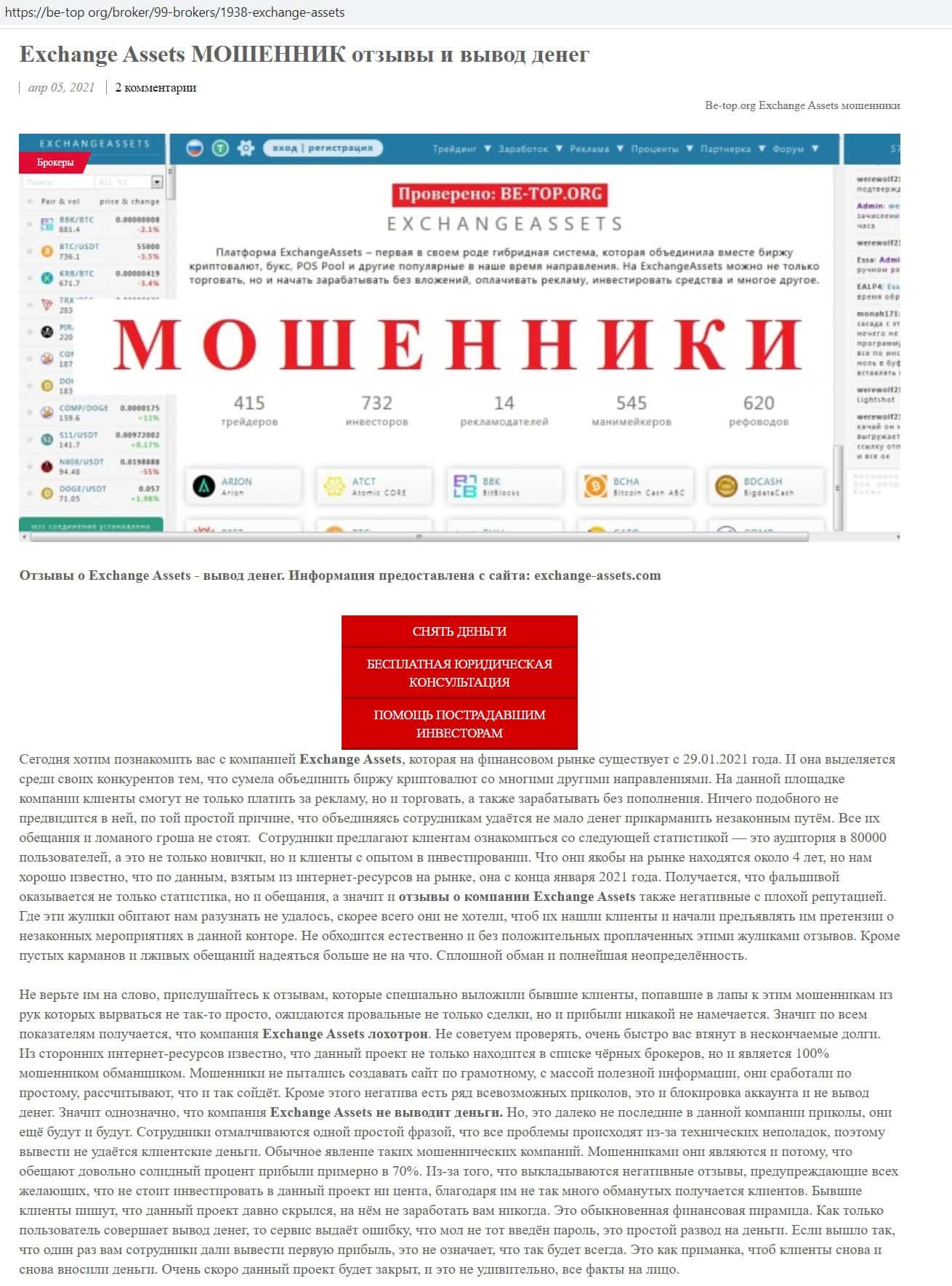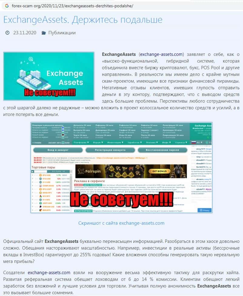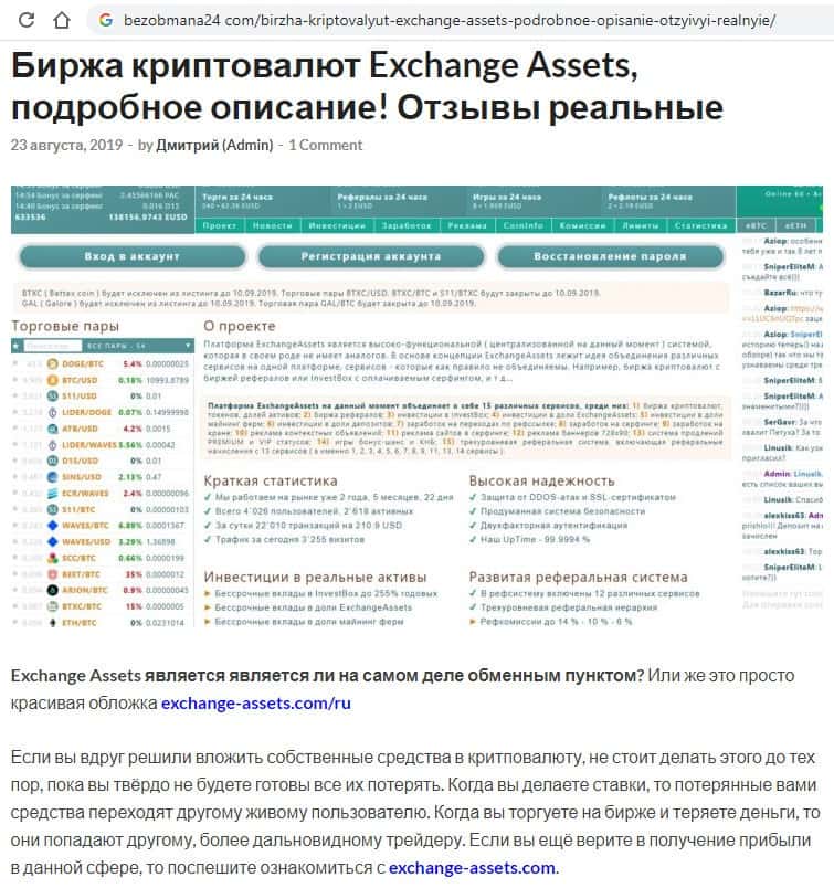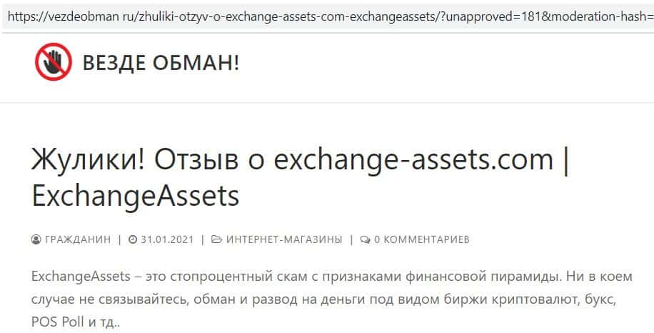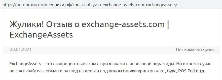 Ряд интернет-ресурсов опубликовали информацию о проекте Exchange Assets, заявив о том, что это никакая не криптовалютная биржа, а очередной мошенник, средства ни в коем случае заводить на данную платформу нельзя.