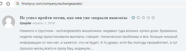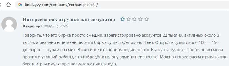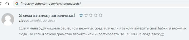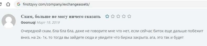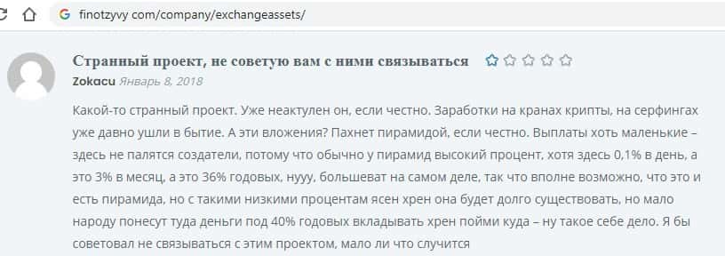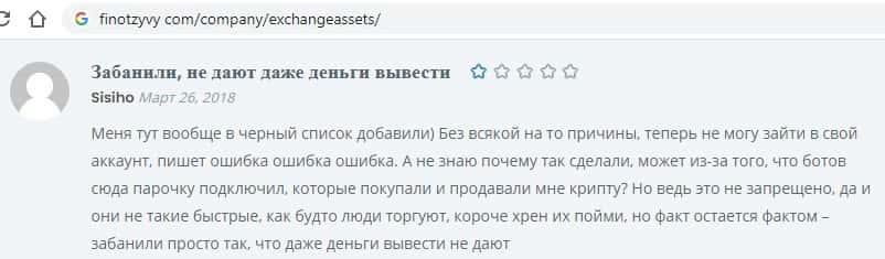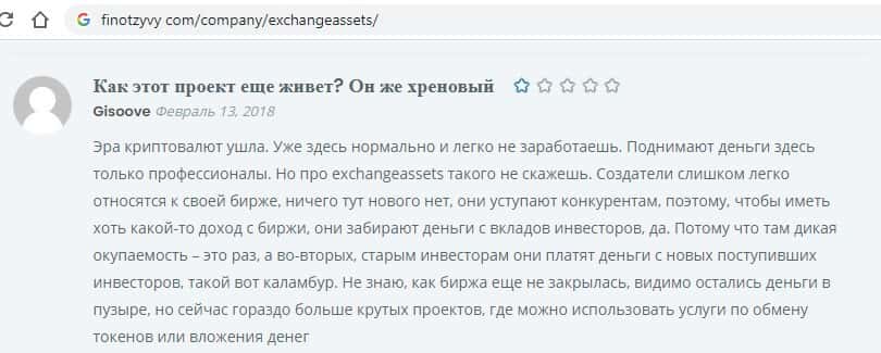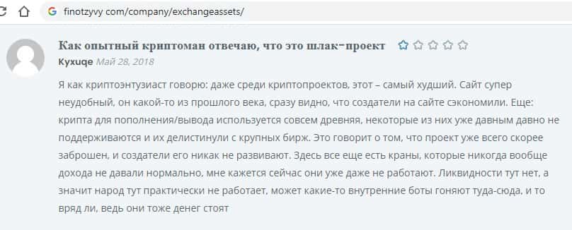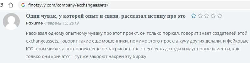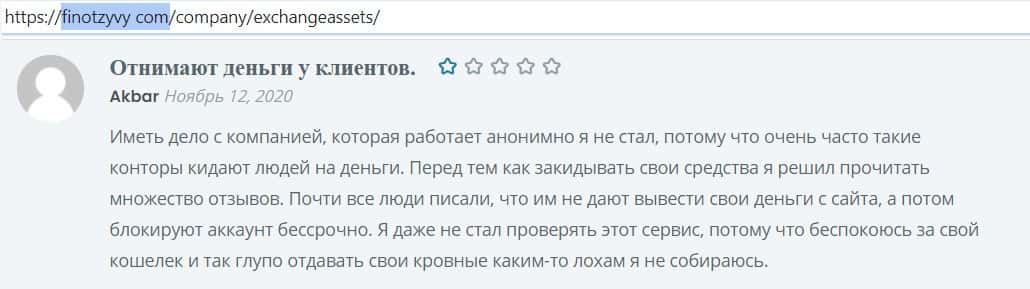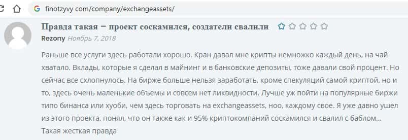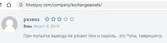 Далее представлен отзыв с сайта finotzyvy com, в котором пользователь всемирной паутины очень точно описывает ситуацию с криптовалютной площадкой Эксчейндж Ассетс.