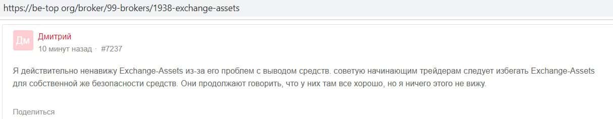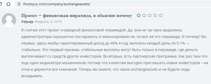 Очередной интернет-пользователь заявил о том, что Эксчейндж Ассест является мошенническим проектом, поэтому вводить деньги на данную платформу ни в коем случае нельзя.