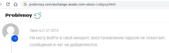 Далее представлен очередной отзыв от человека, которому так и не удалось вывести деньги из Exchange Assets, по другому быть не может, это обычный дешевый скам-проект, никакая не солидная организация.
