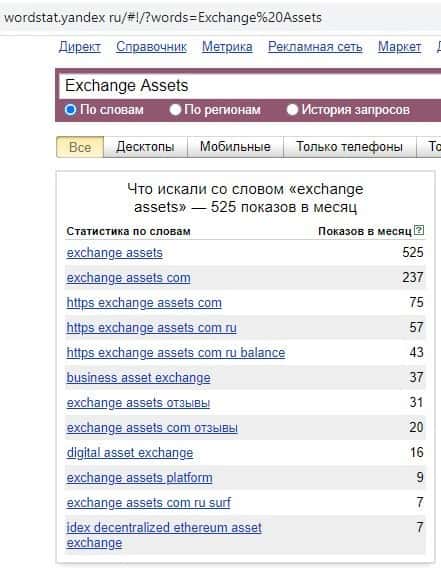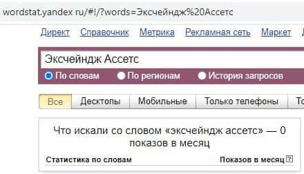 Начинаем с запросов на русском языке. Первый запрос на русском языке в яндексе "Эксчейндж Ассетс" выдает результат в 0 показов. По такому запросу информацию не ищут.
