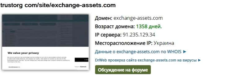 Официально домен мошенников exchange-assets com существует 1358 дней. Это очень большой срок для того, чтобы обмануть много людей.