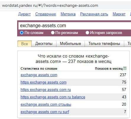 Третий и последний запрос в яндексе на английском языке с точкой "exchange-assets.com" выдает результат в 237 показов в месяц.