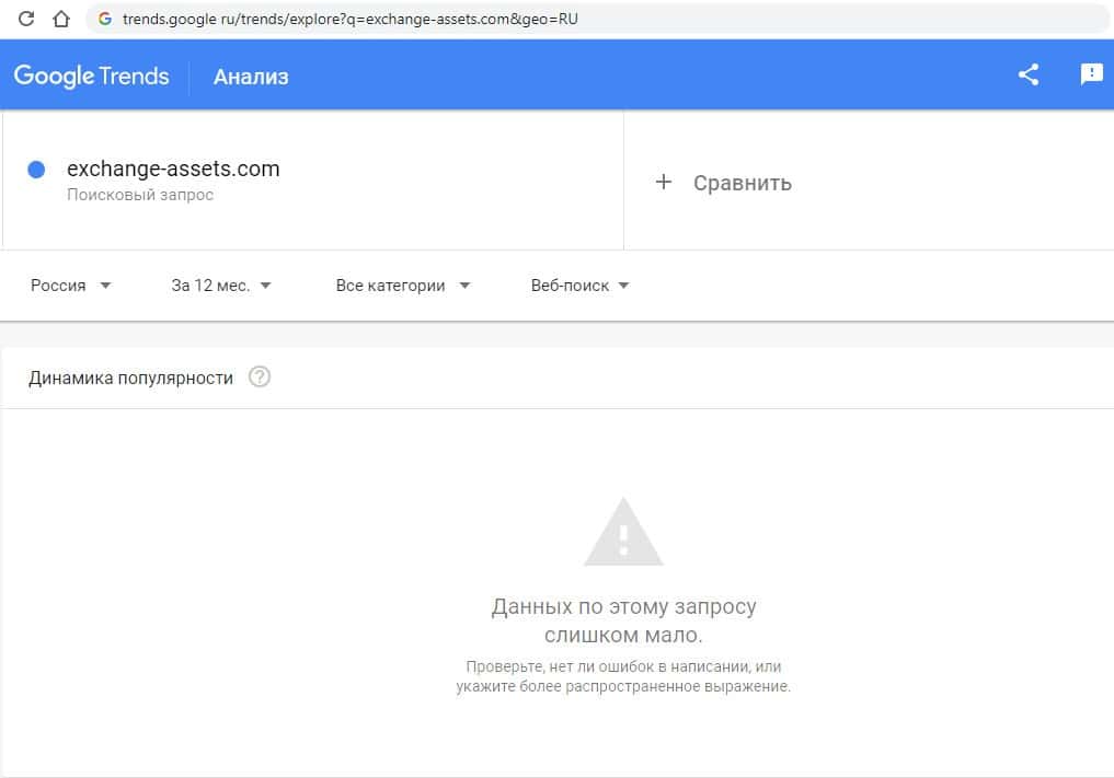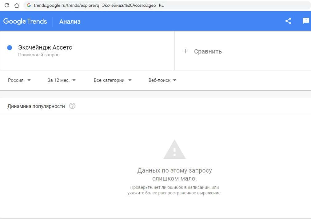 Третий запрос в гугл на английском языке с точкой "exchange-assets.com" выдает точно такой же результат, как и в первых двух случаях - 0 показов в месяц.