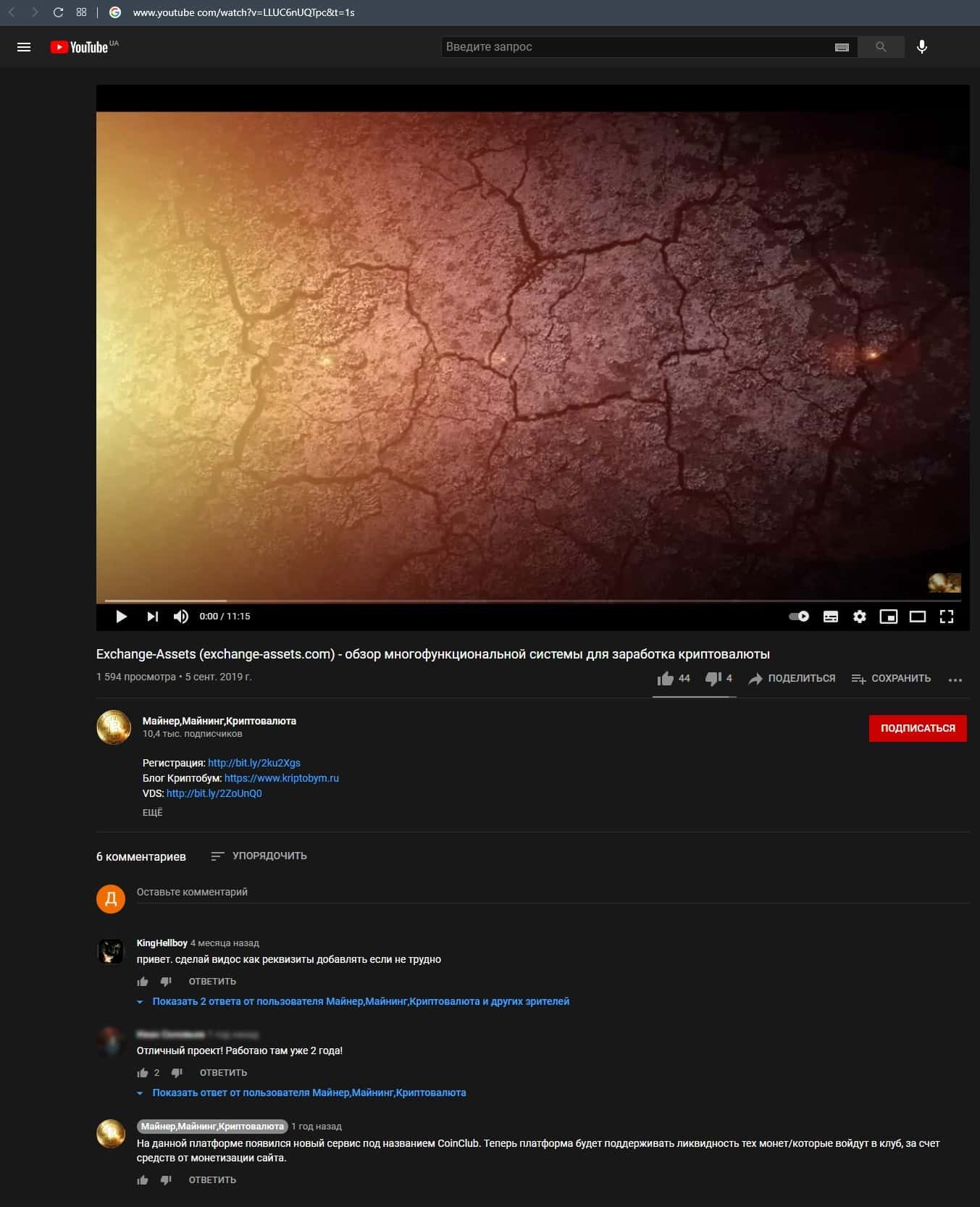 Из следующего скриншота можно увидеть доказательство, что вышеупомянутый аккаунт через ютуб занимается рекламой лохотрона Эксчейндж Ассетс, используя рекламное видео.