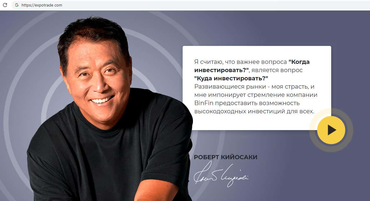 Для того, чтобы создать иллюзию надежности компании, скам-контора Экспо Трейд решила разместить цитату известного американского предпринимателя Роберта Кийосаки. Мы не знаем говорил ли он в действительности эту фразу, но уверенны в том, что данная цитата не имеет никакого отношения к деятельности компании Бин Фин.