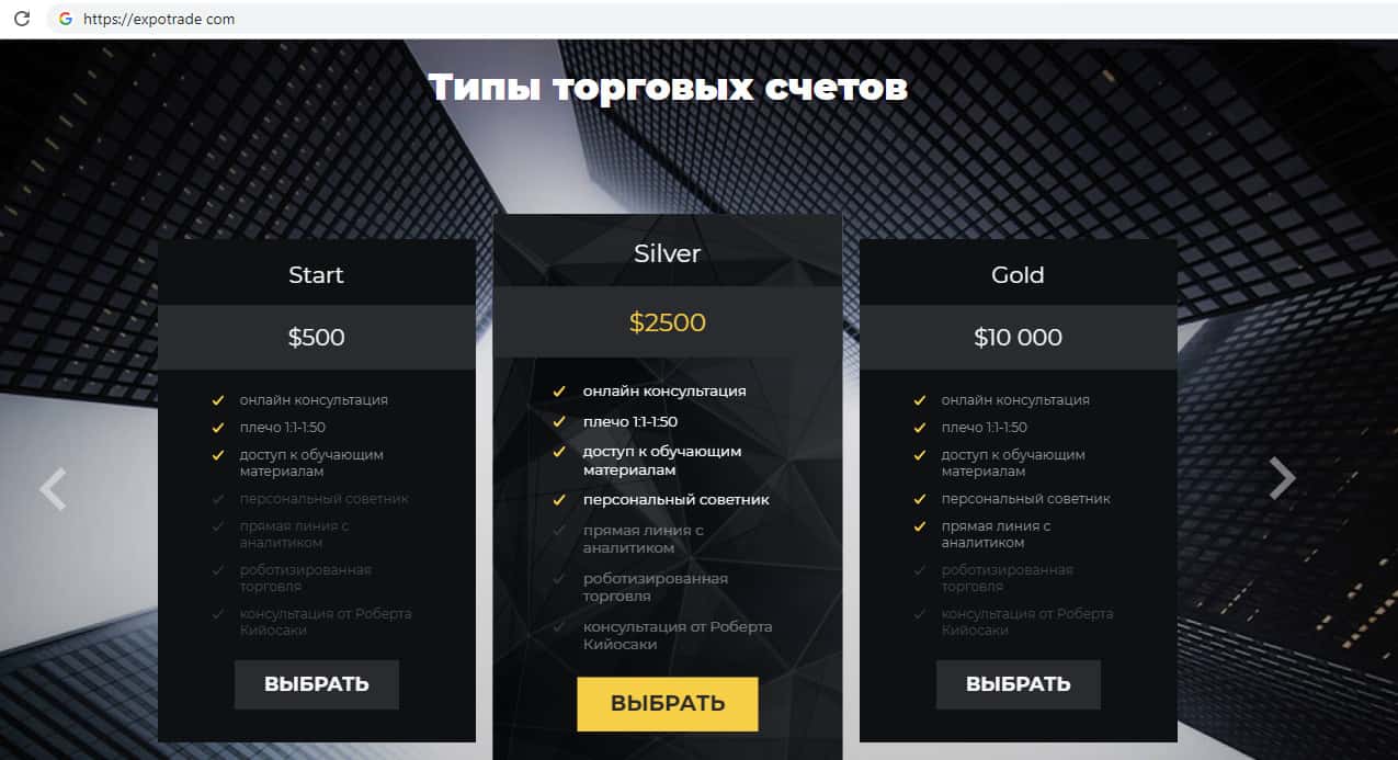 - Типы торговых счетов представленных на сайте скам-брокера ExpoTrade