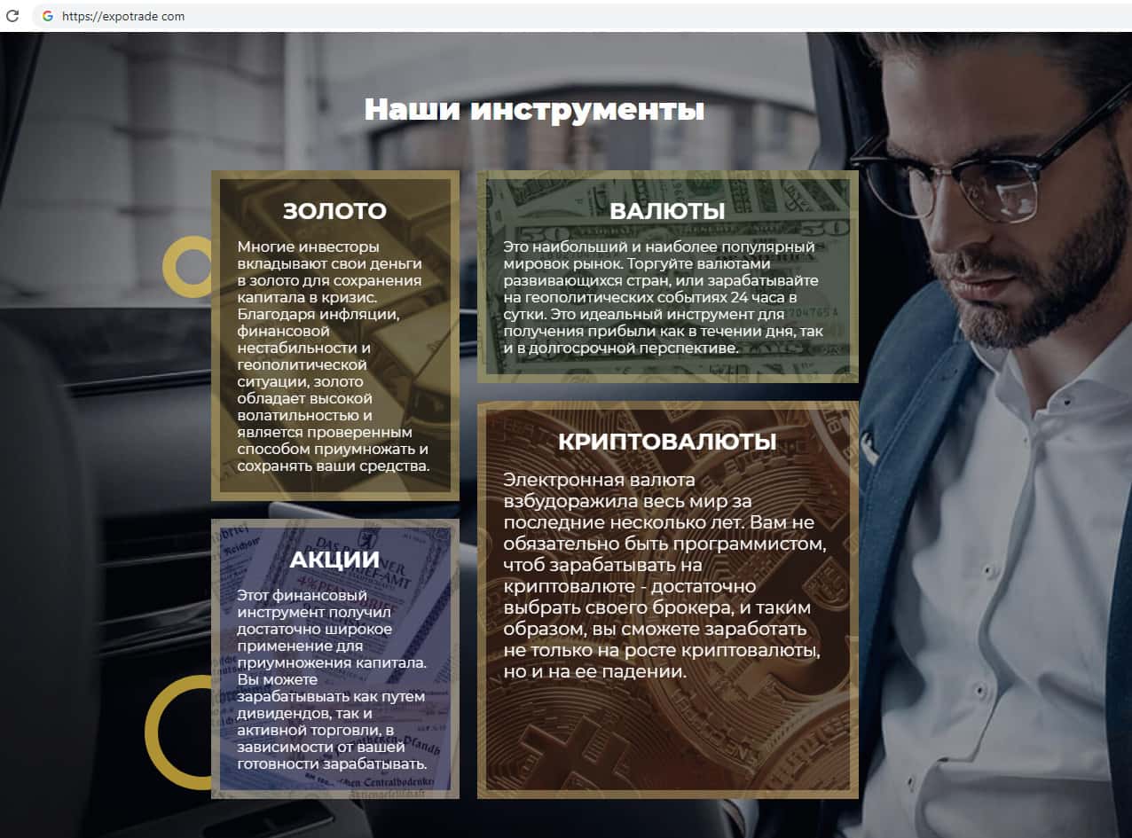 Мошенники ExpoTrade предлагают своим клиентам якобы прибыльную торговлю на сайте, а так же инвестиционные услуги. Для торговли на сайте жулики Бин Фин предлагают такие инструменты как: золото, акции, а так же криптовалюты. О прибыли на сайте конторы Экспо Трейд можно забыть, поскольку сайт липовый.