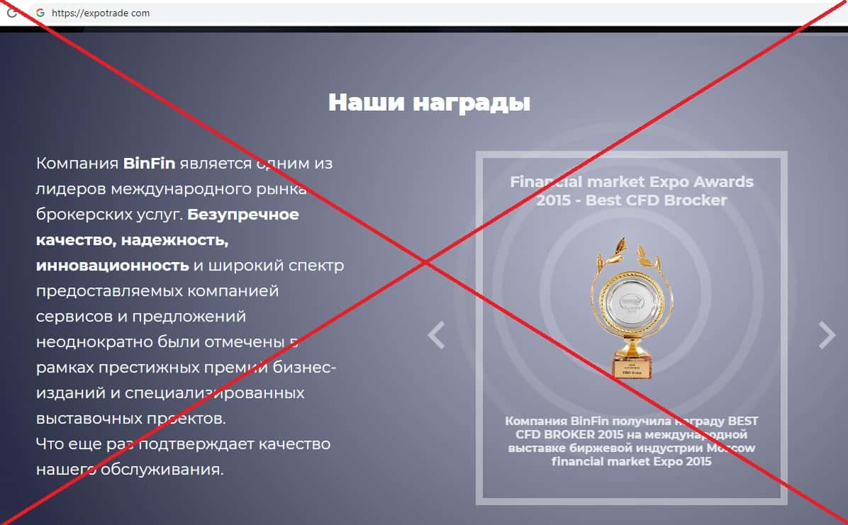 Шуллера ExpoTrade на своем официальном сайте разместили награды, которые неизвестно кому на самом деле принадлежат. Компания Бин Фин нагло врет о своих достижениях, поскольку данная контора липовая и часто меняет сайты в глобальной сети интернет.