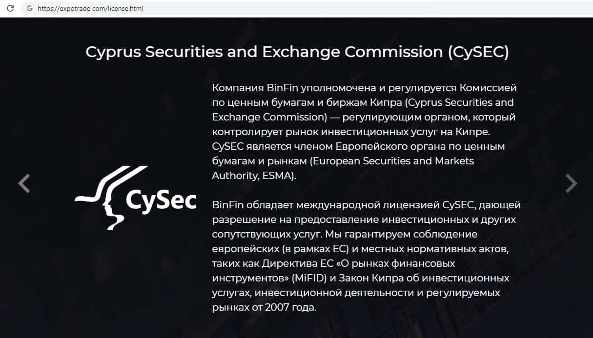 Скам-организация Бин Фин имеет кипрскую регуляцию, именно поэтому данная мошенническая контора не имеет права предоставлять свои брокерские и инвестиционные услуги на территории Российской Федерации. Поэтому прежде чем связаться с жуликами ExpoTrade необходимо ознакомиться со всей информацией на сайте.