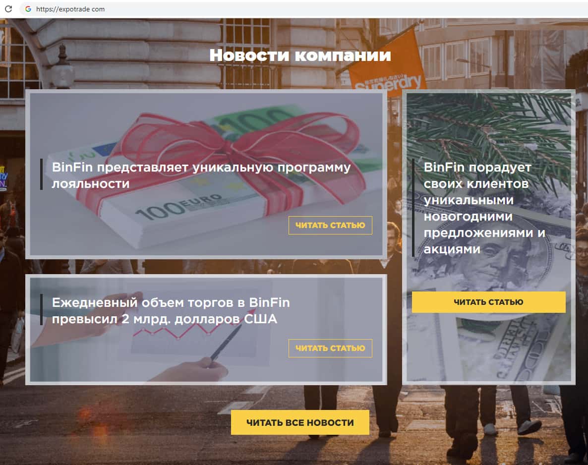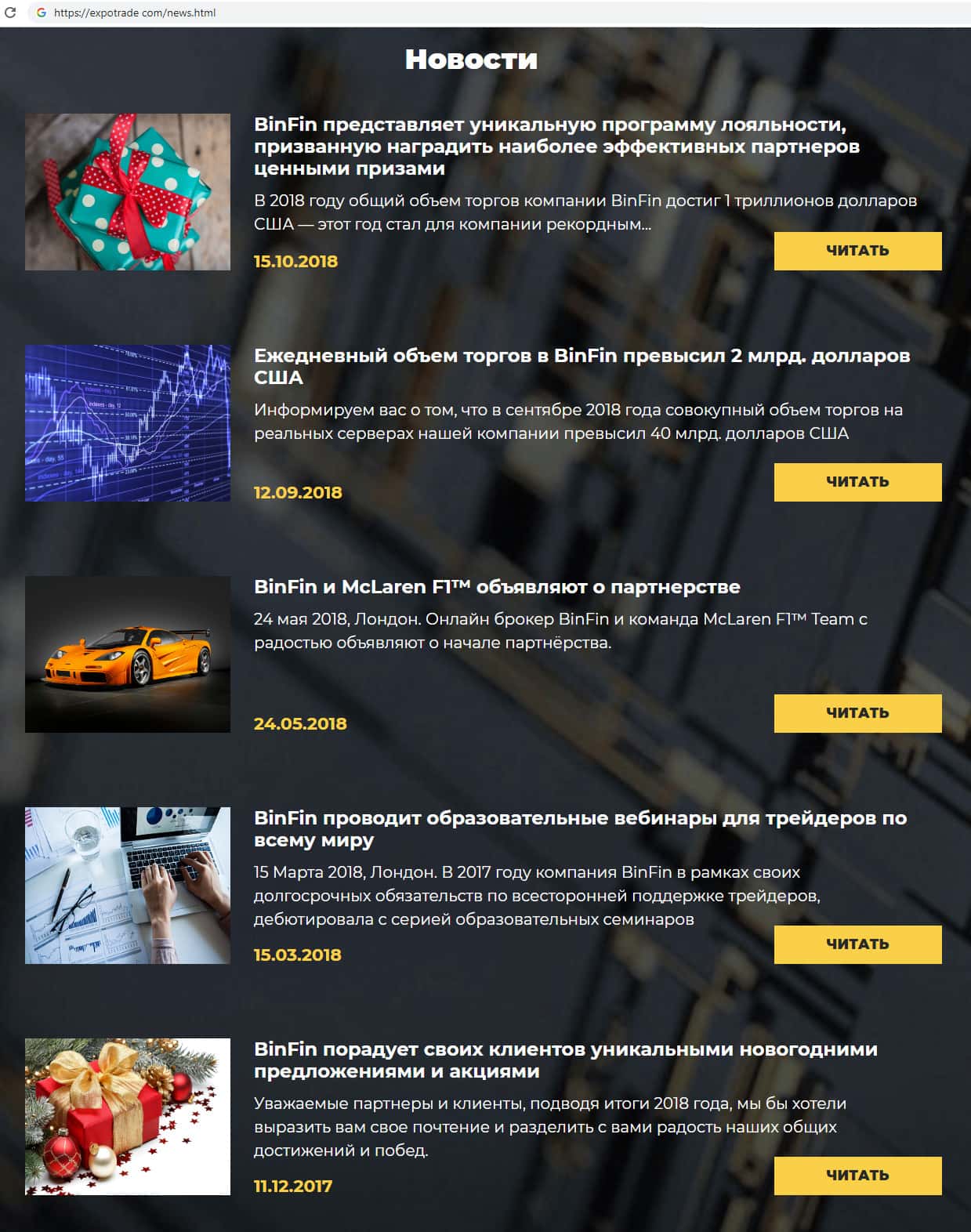 Для того, чтобы казаться реально существующей брокерской компанией, шуллера BinFin используют стандартную мошенническую уловку, а именно разместили новости на официальном сайте скам-организации Экспо Трейд. Даже если все написанное правда, то это все равно не может быть гарантией надежности данной конторы.