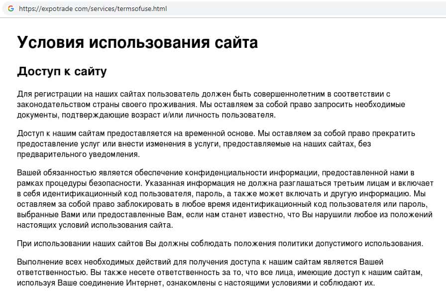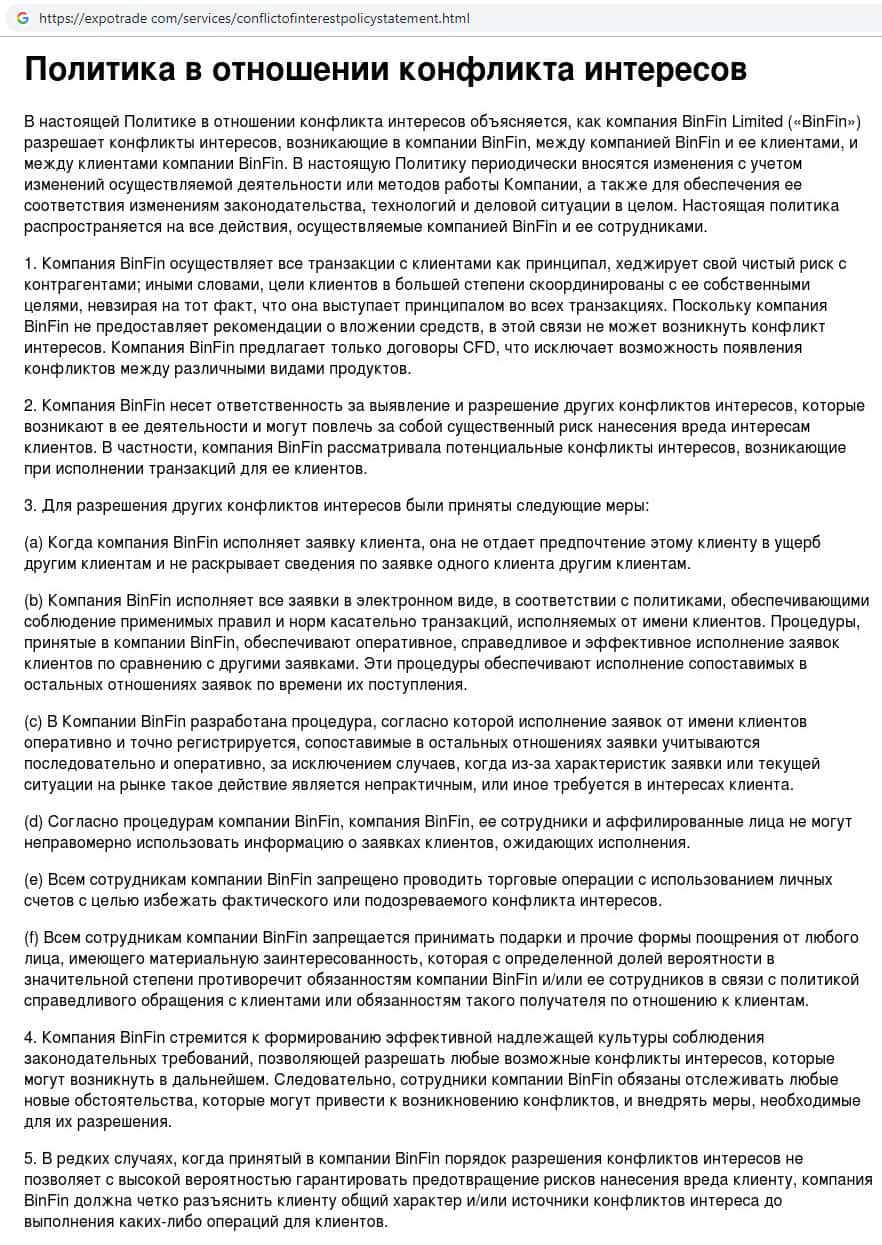 Не трудно обратить внимание, что скам-организация ExpoTrade предоставляет пользователю документацию, которая по какой-то причине изложена на русском языке. При том, что сайт конторы Бин Фин на английском. Данная контора создает видимость того, что несет ответственность в отношении конфликта интересов среди клиентов компании.
