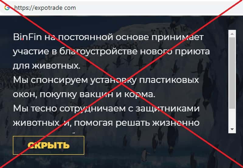 Брокерская контора Бин Фин для того, чтобы надавить на жалость доверчивых людей, создает видимость будто занимается благотворительной деятельностью, а именно благоустройством приютов для животных и якобы финансирует детские приюты. На самом деле скам-брокер ExpoTrade не имеет к этому никакого отношения.