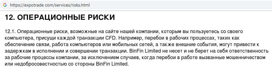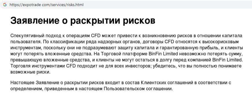 На официальном сайте конторы ExpoTrade имеется информации о всевозможных рисках потери денежных средств. Предупреждая клиента об этом, скам-организация BinFin таким образом снимает с себя ответственность за то, что клиент не сможет вернуть все свои вложенные денежные средства, а о прибыли не может быть и речи.