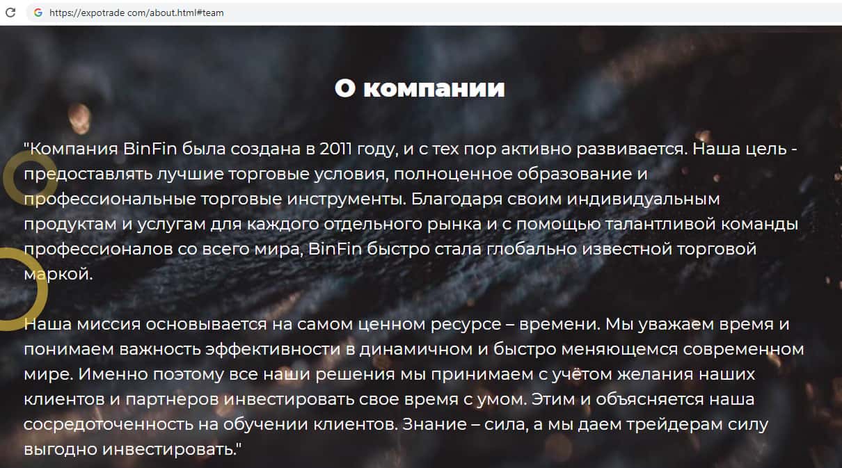 На своем официальном сайте брокерская контора BinFin описывает целую историю возникновения компании. Мошенники ExpoTrade врут о том, что главная цель их компании - предоставить лучшие торговые условия и полноценное образование. А в документации указано, что компания не имеет права консультировать клиентов.