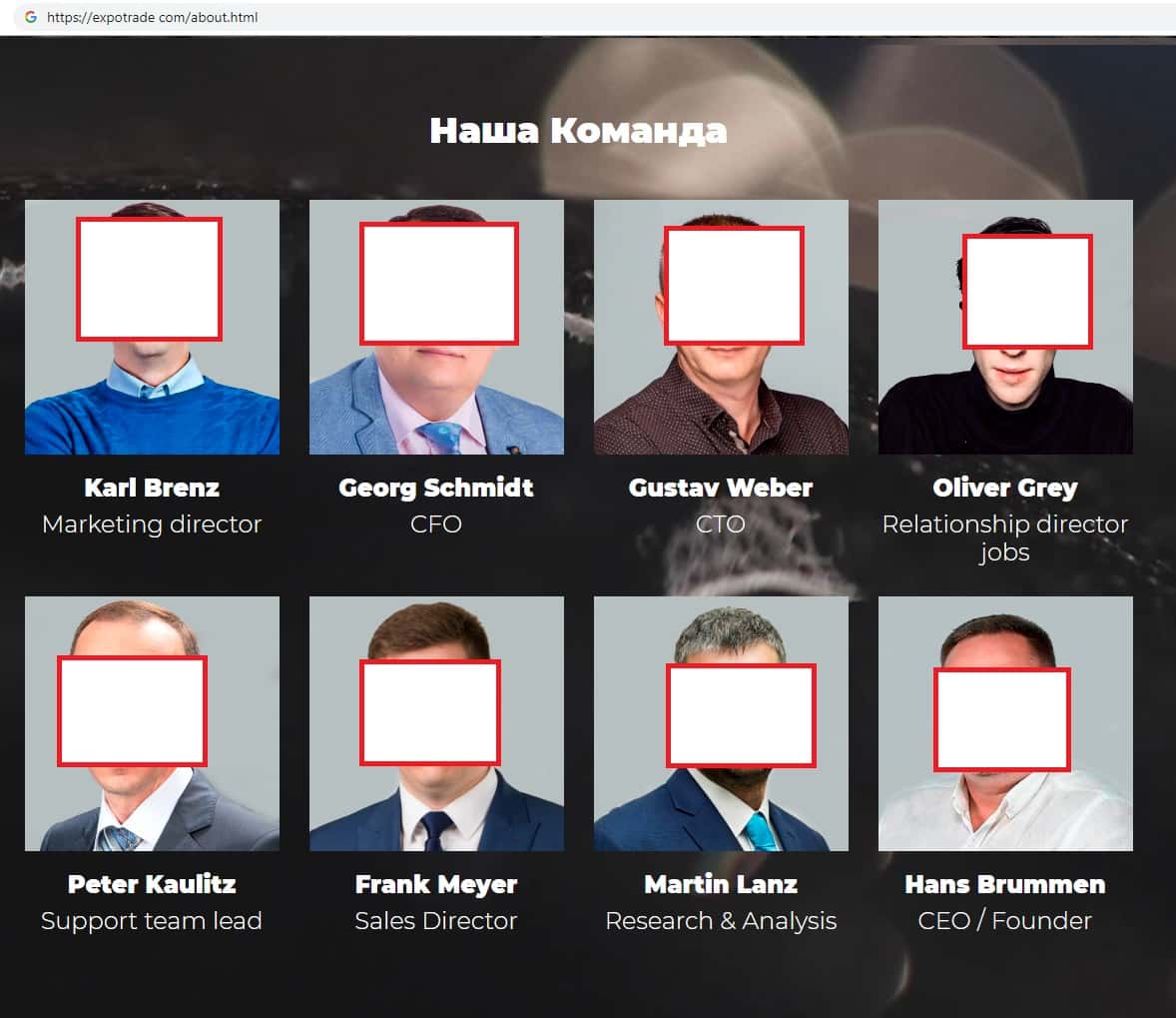 О команде своей организации скам-брокер Экспо Трейд практически никакой информации не указывает. На официальном сайте компании ExpoTrade имеются фотографии каких-то людей, их имена и фамилии и должности, которые они якобы исполняют. Нет никакого доказательства того, что данная информация на их сайте является достоверной.