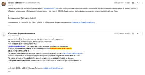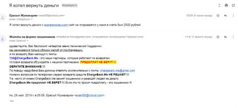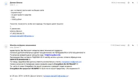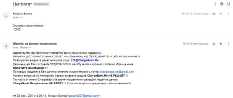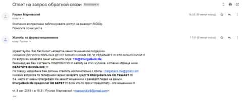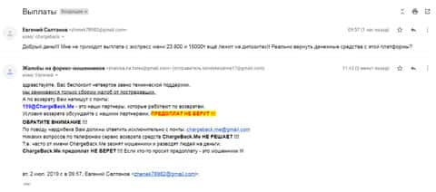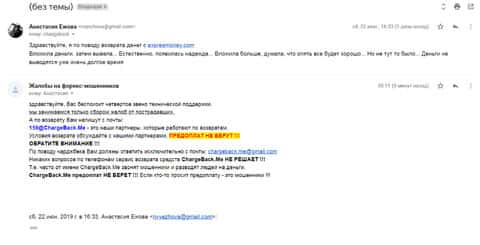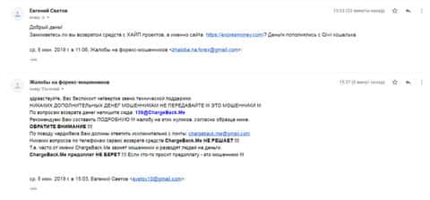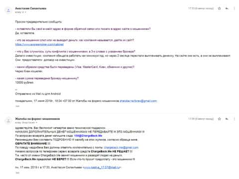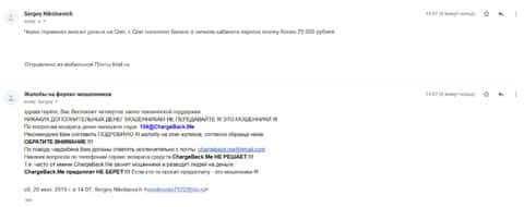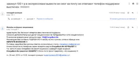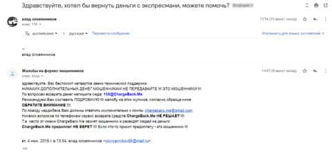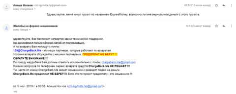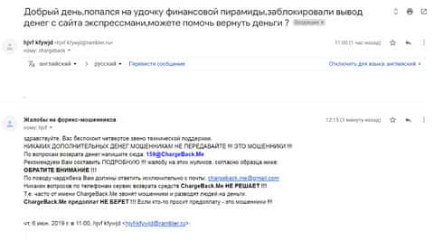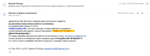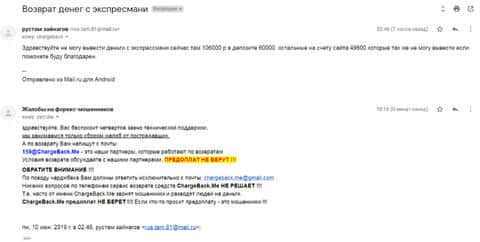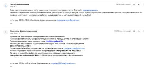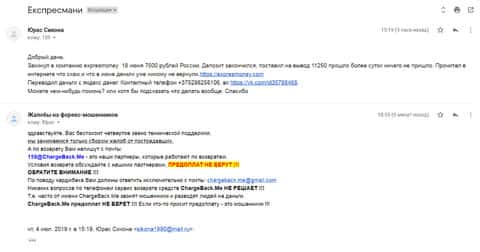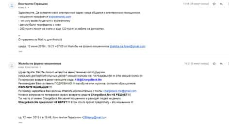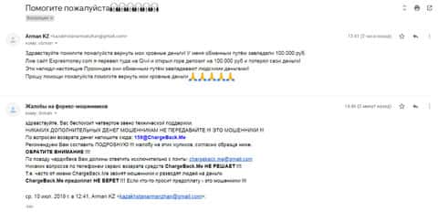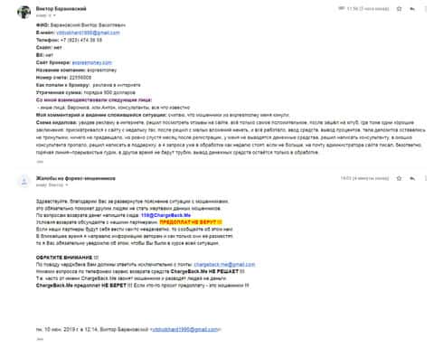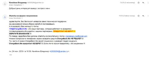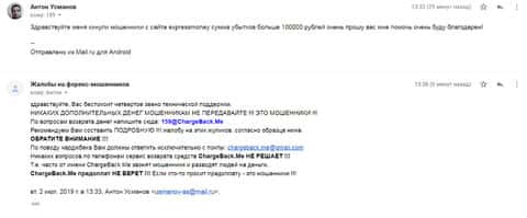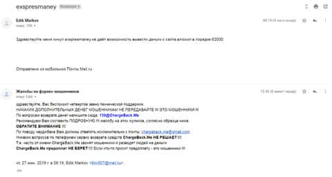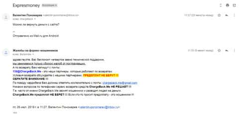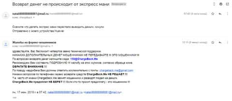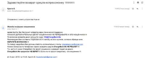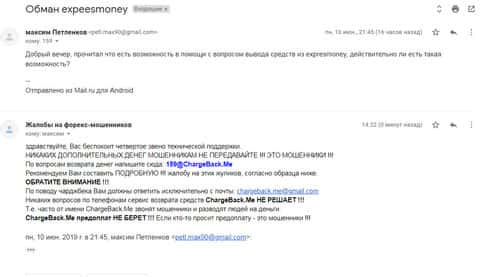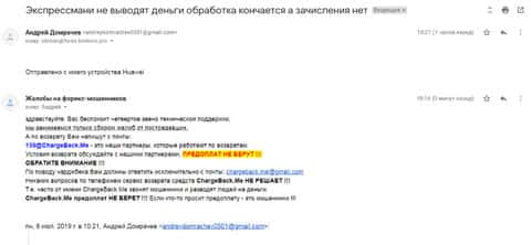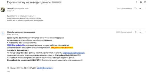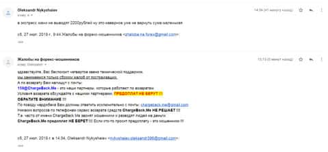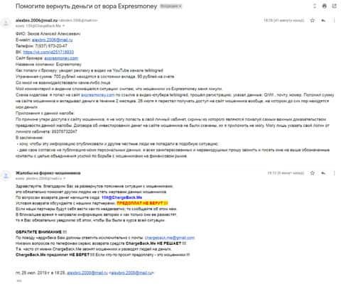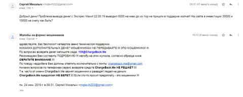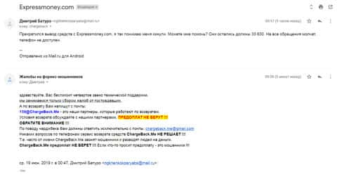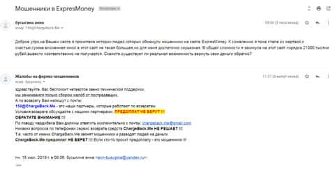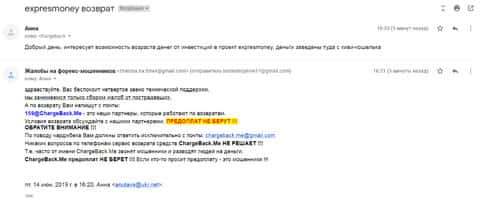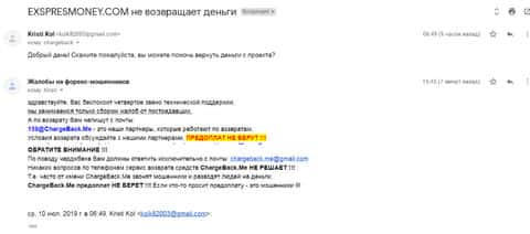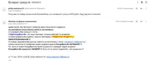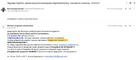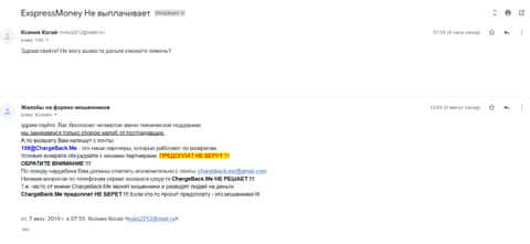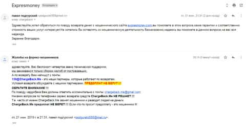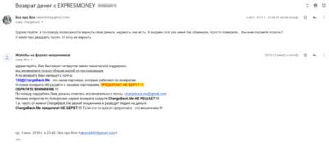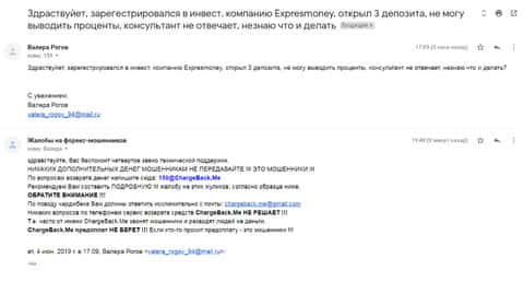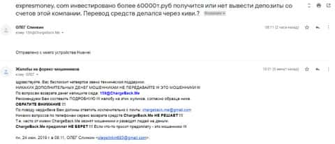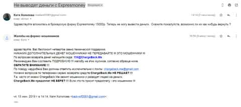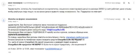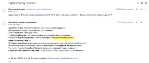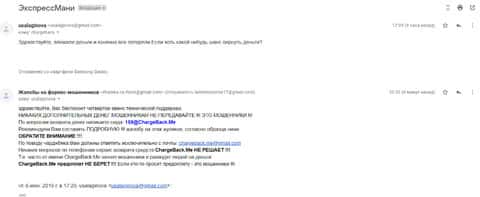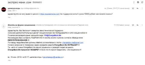 Очередное письмо с жалобой на аферистов Экспрес Мани пришло на почтовый адрес веб-площадки по сбору жалоб на брокеров-мошенников. Пострадавшему клиенту scam-организации посоветовали обратиться в специализированную службу ChargeBack.Me за помощью.