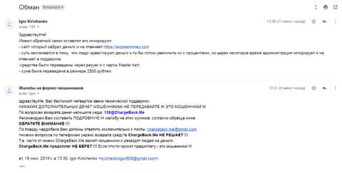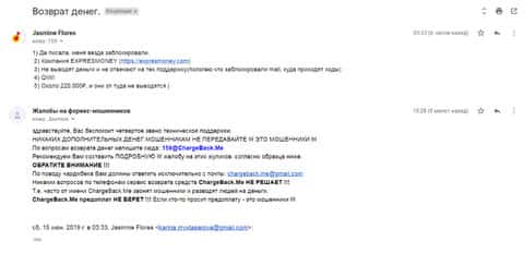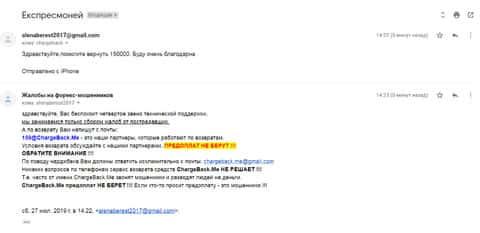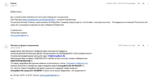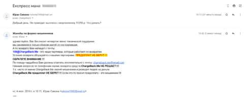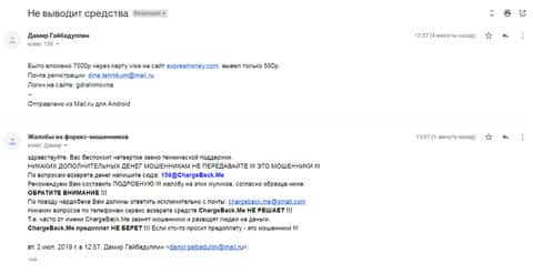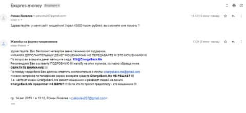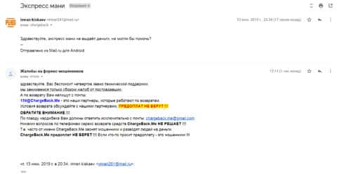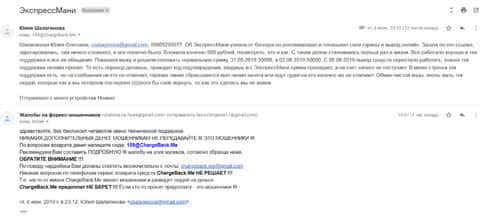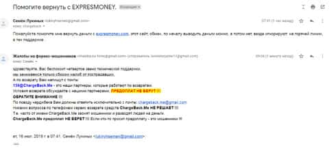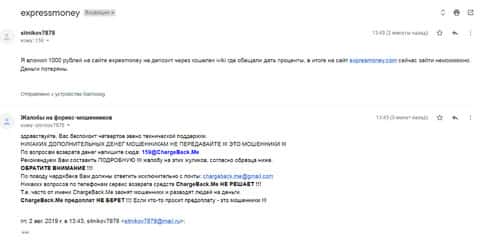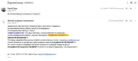 Очередная жалоба на мошенническую контору Экспресс Мани пришла на почтовый адрес веб-площадки по сбору информации о деятельности форекс-аферистов. Пострадавшему клиенту интернет-лохотрона Експрес Мани посоветовали обращаться в ChargeBack.Me за помощью.