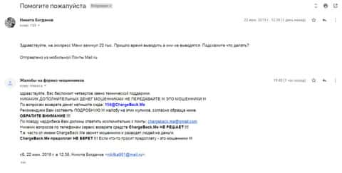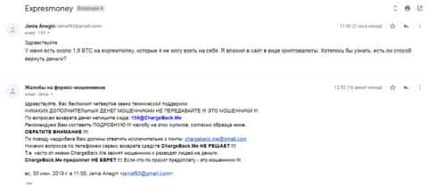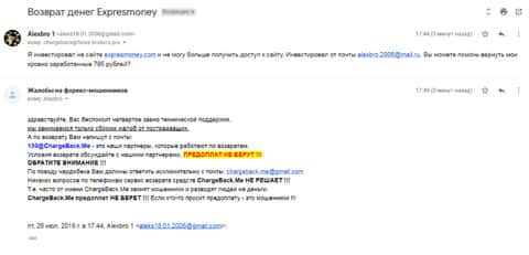 Еще одно обращение поступило в компанию ChargeBack.Me с просьбой о помощи вывести деньги из интернет-лохотрона ExpresMoney. На этот раз клиент доверился и вложил 20000 рублей, но когда понял, что это лохотрон, попытался вернуть обратно. На данный запрос никто так и не ответил.