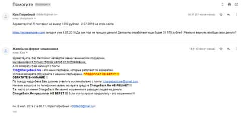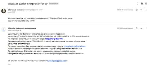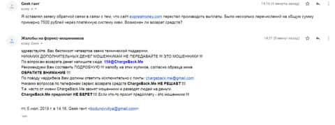 Автор последующего информационного материала в виде жалобы на аферистов Экспресс Мани ведает о том, что он нуждается в помощи по возврату украденных денежных средств. На сайте по сбору жалоба на брокеров-мошенников, ему рекомендуют обращаться в ChargeBack.Me